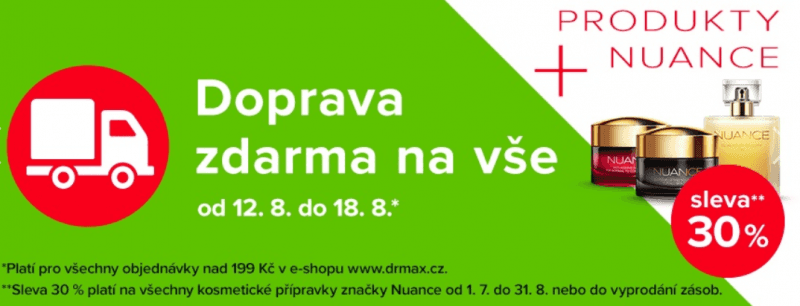 Využijte právě probíhající dny Dr. Max s dopravou zdarma! Ve dnech 12. 8. - 18. 8. 2019 při nákupu nad 200,- neplatíte dopravu! Doplňte si zásoby ve Vaší lékárničce, nakupte kvalitní kosmetiku a využijte neustále probíhající slevové akce.