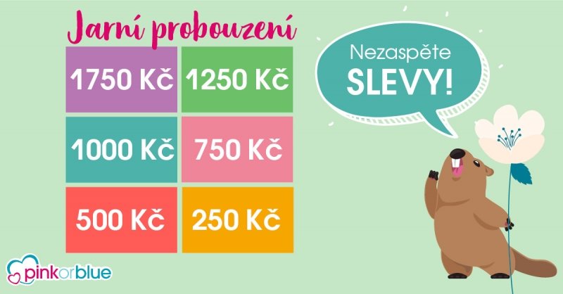 Připravte se s dětmi na jaro díky Jarnímu překvapení na eshopu Pinkorblue.cz! Pouze v neděli a pondělí 28. - 29. 3. 2021 na Vás čeká 6 slevových kupónů, které můžete využít podle hodnoty Vaší objednávky. Využijte tyto slevy na nákup potřeb pro děti, hraček pro děti, dětského oblečení, kočárku, autosedačky nebo vybavení do dětského pokoje.