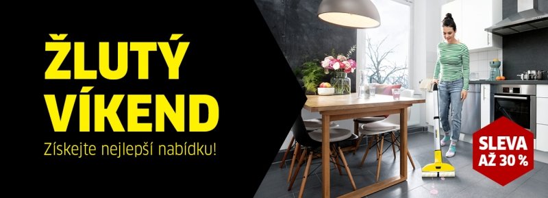 Ani Váš partner pro čistící techniku Kärcher nezůstává pozadu a spouští pro Vás Žlutý víkend plný slev! Od pátku 29. 11. 2019 můžete vybírat techniku se slevou až 30%! Teď už Vás v úklidu domácnosti, zahrady nebo garáže opravdu nic nezastaví. I Ježíšek jistě ocení dny plné slev a vybere Vám přesně to, co k práci potřebujete. Akce trvá do 2. 12. 2019, takže si pospěšte, ať nakoupíte opravdu vše.