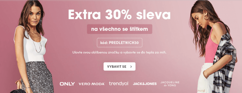 Na ZOOT.cz vypukly předletní slevy a Vy můžete nakupovat dámskou i pánskou značkovou módu se slevou 30%! Hledejte oblečení a boty označené slevovým kódem a jen přidávejte do košíku. V něm následně zadejte akční kód PREDLETNICH30 a sleva je Vaše.