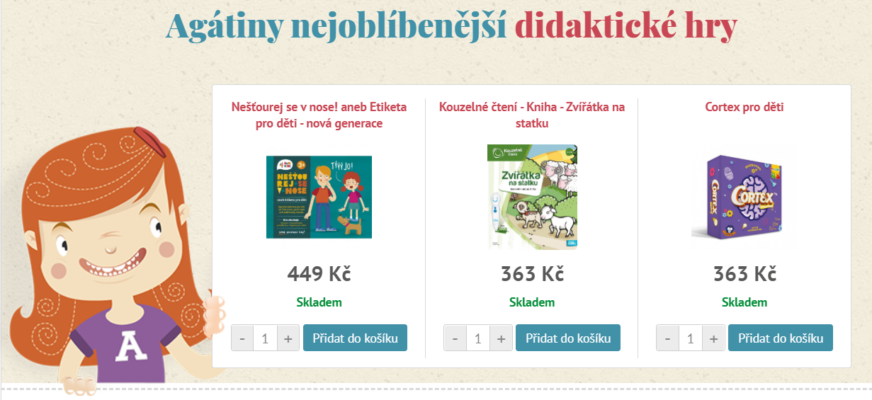Opravdu smysluplná hračka je ta největší odměna, kterou získáte po jejich dlouhém výběru. Přesně o to se snaží Agátin svět, který přináší obrovskou nabídku zajímavých, krásných a kvalitních her, do kterých se zamilují jak děti, tak i rodiče. Velmi pohodlně můžete filtrovat hračky a potřeby podle věku dětí a zaměření, které Vás zajímá.