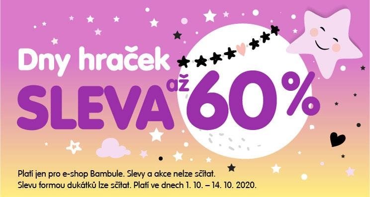 V eshopu Království hraček Bambule právě běží DNY HRAČEK, během kterých můžete nakoupit vybrané hračky se slevou až 60%! Tato skvělá slevová akce trvá do 14. 10. 2020, takže neváhejte ani chvilku ať Vám neuteče žádný skvělý dárek k svátku, narozeninám, pod stromeček nebo pro radost. Vyberete hračky pro nejmenší děti i pro velké školáky. Vše z pohodlí domova a za malou chvilku.