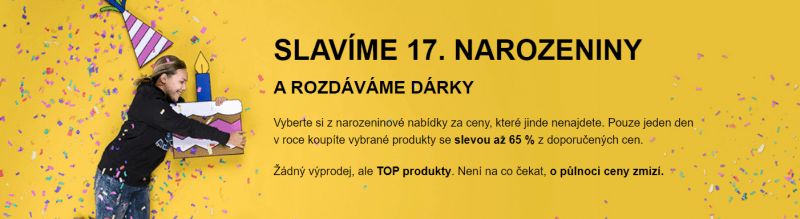 Právě dnes 15. 10. 2019 slaví své 17. narozeniny SportObchod.cz, dárky si však rozbalí jeho věrní zákazníci! Po celý den budete moci nakupovat nejoblíbenější a nejžádanější produkty se slevou až 65%! Ke každému nákupu Vás čeká dárek zdarma a pokud budete mít extra štěstí a trefíte jakoukoliv 100. objednávku, nezaplatíte za ni ani korunu! Čas běží, takže rychle vybírejte z široké nabídky sportovního vybavení. Akce trvá pouze do půlnoci.