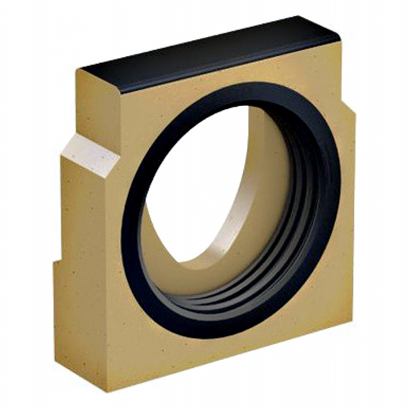 Čelní stěna s integrovaným těsněním pro horizontální, vodotěsné připojení základního vedení DN 150, odvodňovacího systému ACO MultiDrain je vyrobena s polymerbetonu o tloušťce 40 mm, s ochrannou hranou z pozinku (V150S).