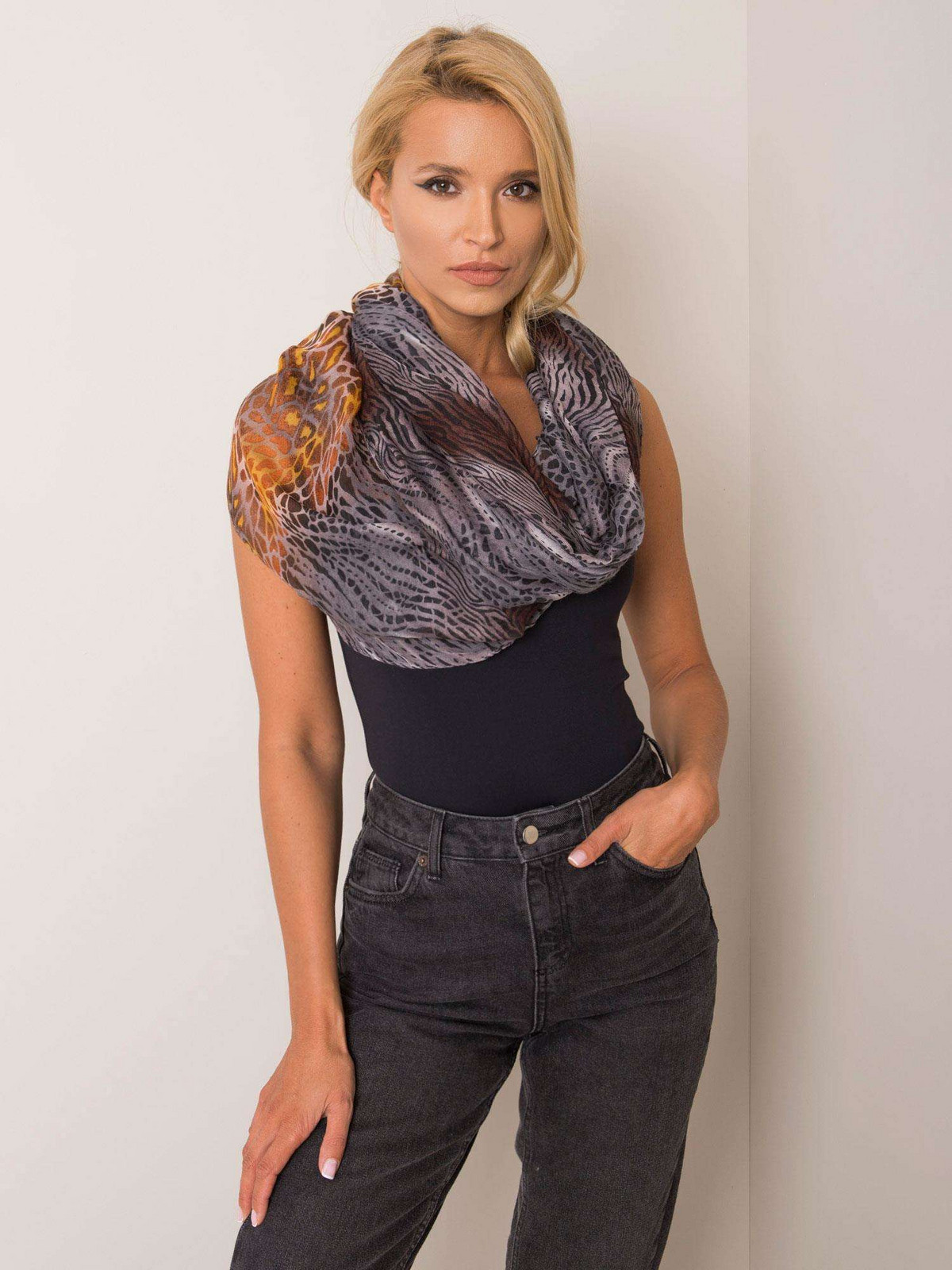 A gray-yellow scarf with patterns.