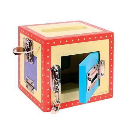 Tato pestrobarevná dřevěná skříňka obsahuje čtyři různé zámky na čtyřech dveřích. Vymyslete, jak otevřít každý zámek, a budete odměněni speciálním klíčem! Pomáhá rozvíjet obratnost a koordinaci. Vyrobeno z vysoce kvalitních, zodpovědně získaných materiálů. Splňuje aktuální evropské bezpečnostní normy. Hlavní vlastnosti: každá strana má jiný zámek k prozkoumání a otevřeníuvnitř se skrývá překvapení - velký klíčzlepšuje obratnost a koncentraci