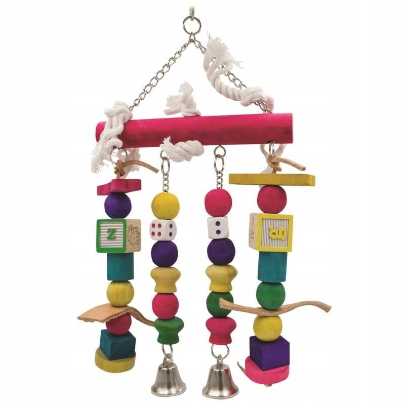 Barevná, super dřevěná, barevně překypující hračka ze dřeva s provázky, spoustou křupavých dřevěných korálků a zvonkem pro střední a malé papoušky.