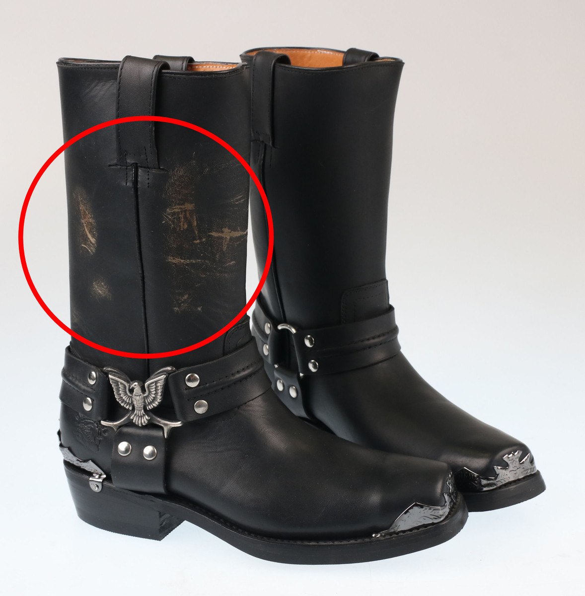 Pravá boty má poškozenou kůži - viz foto - jedná se o nový a nepoužitý produkt - vada vznikla při výrobě.