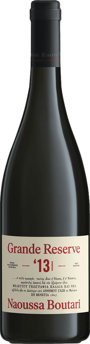 Lze skladovat ve sklepě po dobu 20 let. Doporučuje se dekantovat hodinu a půl. Vinařství Boutari bylo založeno v roce 1879 Ioannisem Boutarim v Naousse a je jedním z nejstarších vinařství v Řecku. Od té doby společnost rozšiřovala svou činnost, počínaje výstavbou prvního soukromého vinařství na počátku devadesátých let minulého století a následně dalšími místy na Santorini, v Naousse, Goumenisse, Mantinii, Attice a na Krétě v následujících letech. Dnes je společnost Boutari Wineries součástí skupiny Sterner Stenhus Greece a pokračuje ve výrobě svých ikonických vín. Hrozny odrůdy Xinomavro se vybírají a sklízejí na pozemcích v Trilofosu. Vinifikace probíhá odděleně v šaržích v ocelových tancích při kontrolované teplotě. Hotová vína pak zrají odděleně ve francouzských dubových sudech po dobu dvou let, než se smíchají a stáčejí do lahví. Boutari Grande Reserve Naoussa má intenzivní a tmavou barvu s cihlově červenými tóny. Jeho aromatický profil je široký a voňavý s ovocnými tóny třešní a ostružin, po nichž následují tóny rajčat, středomořských bylin a některé dřevité nuance. V chuti je víno bohaté a velkorysé s dobře integrovanou tříslovinou a dobrou koncentrací ovoce. Má plné tělo a dobře vyváženou kyselinu. Výborně se hodí ke grilovanému vepřovému masu a Porchettě pečené na rožni.