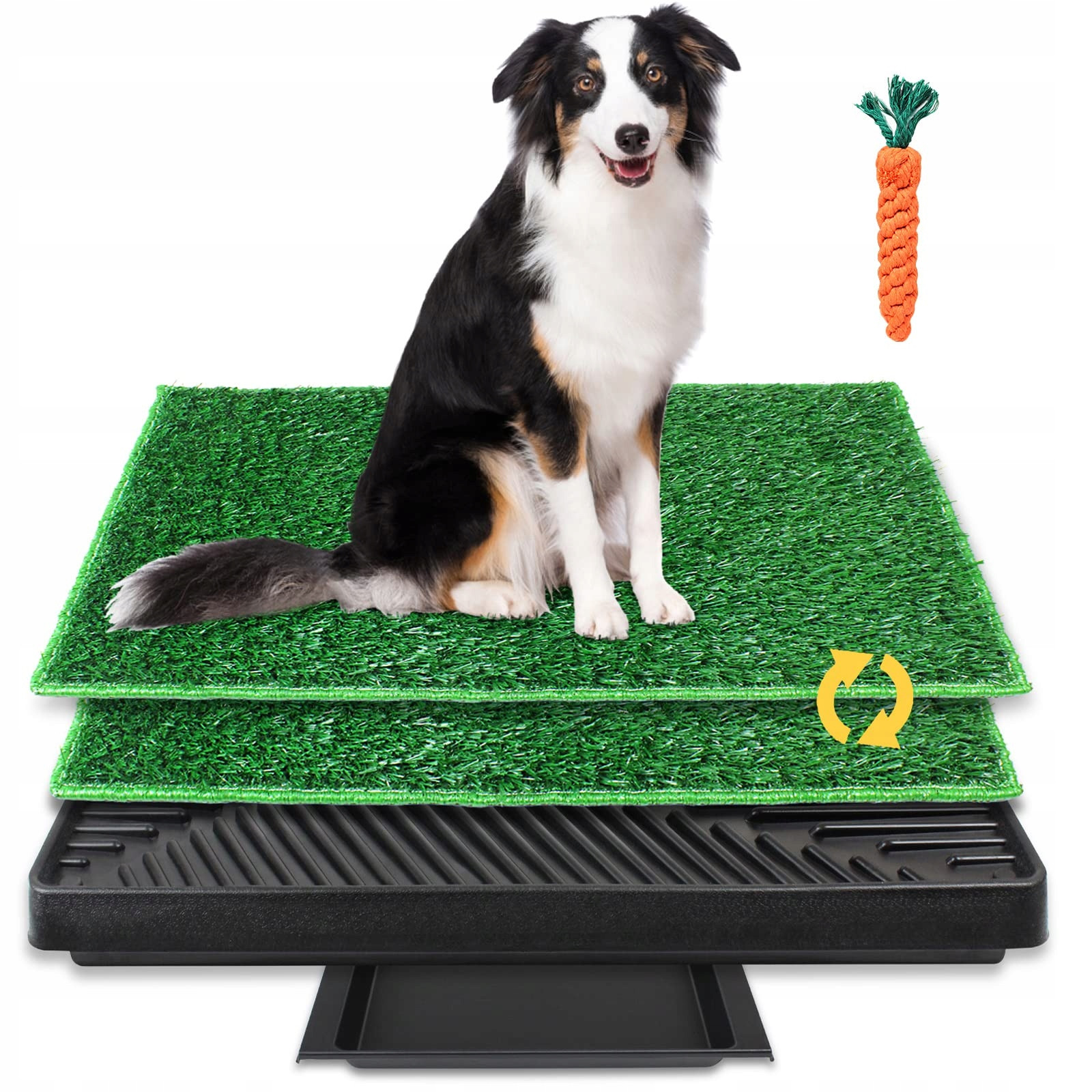 BRIAN & DANY toaleta pro psy, tréninková podložka se 2 vyměnitelnými umělými trávníky, vnitřní/venkovní toaleta pro malé i velké psy, 63 x 51 cm????[2 odolné trávníkové rohože]Balení obsahuje dvě rohože o rozměrech 63 x 51 cm pro každodenní výměnu.????[3vrstvý systém]Trávníková podložka pro psy s podnosem má 3vrstvý design: horní vrstva: rohož z umělé trávy, střední vrstva: žebrovaný sběrný podnos, spodní vrstva: výsuvný sběrný box s velkým objemem, téměř 2 litry.????[Unikátní umělá tráva]Okraj trávníku je vyroben z tkaného materiálu, aby se zabránilo pohybu umělé trávy. Odtokové otvory jsou po celém trávníku a propustnost je vysoká. Tekutina snadno odtéká, aniž by namočila tlapky zvířete. Tím je zajištěno, že tělo a tlapky psa jsou čisté a doma nevznikají nepříjemné pachy.????[Snadné čištění]Spodní vložku lze vyjmout pro snadné čištění. Stačí omýt mýdlem a vodou. Tato toaleta pro psy nabízí velké pohodlí pro psy a jejich majitele. Ideální pro byty a domy bez zahrady.????[Přirozený výcvik zvířat]Toaleta pro psy funguje skvěle jako tréninková podložka. Poskytuje vašim mazlíčkům bezpečné a pohodlné místo pro vyřizování jejich potřeb. Podložka z umělé trávy vypadá jako skutečná tráva, pro psy velmi atraktivní.