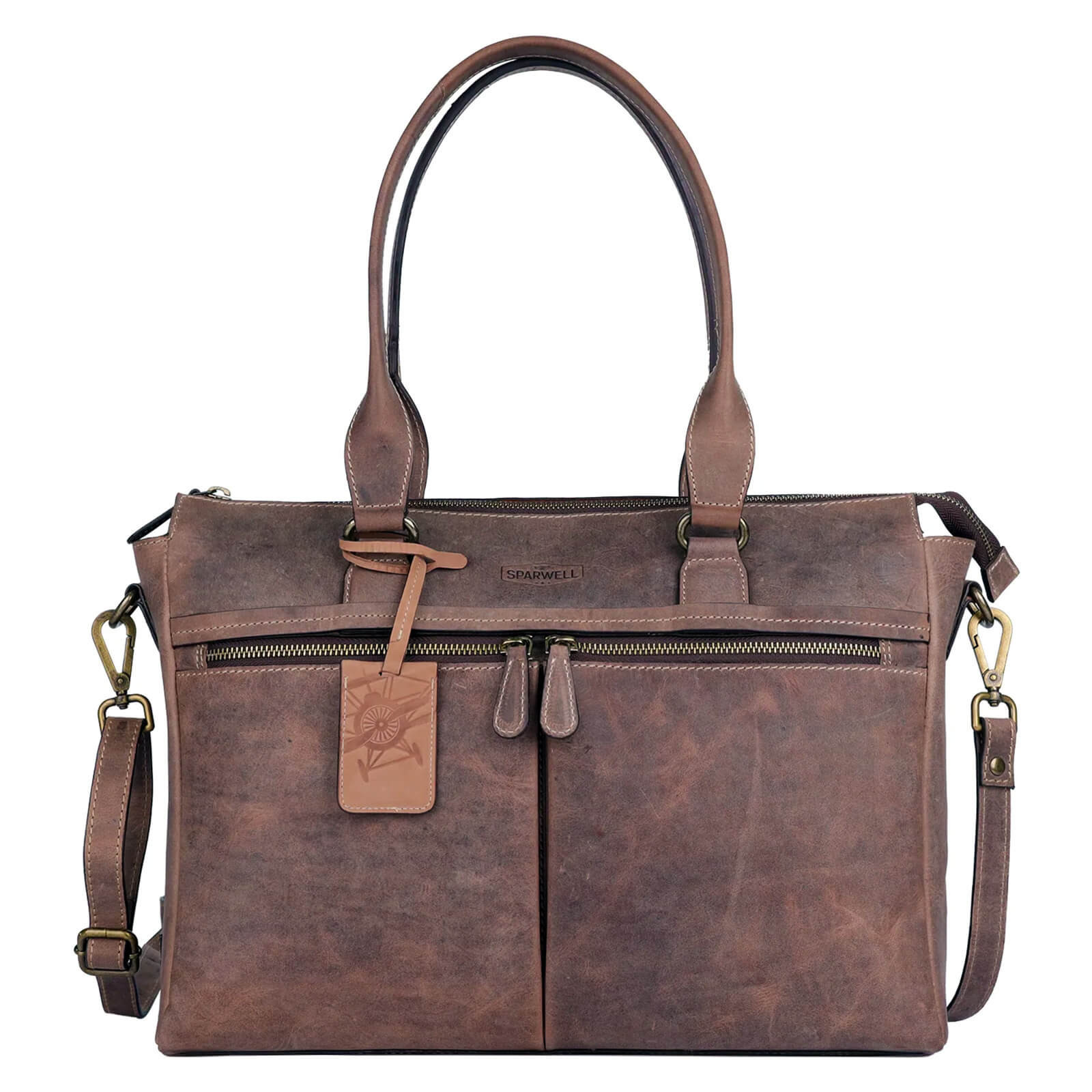 Elegantní kožená dámská kabelka německé značky Sparwell. Elegantní a praktická, kožená dámská kabelka je perfektním doplňkem, který podtrhne ženský styl a poskytne dostatek prostoru pro všechny vaše nezbytnosti. Kabelka na notebook značky Sparwell je vyrobena z prvotřídní, ručně činěné hovězí kůže, která zajišťuje výjimečnou trvanlivost, odolnost a přirozenou krásu. Tato kabelka nabízí prostornou hlavní přihrádku uzavíratelnou na zip. Uvnitř naleznete chytré uspořádání – dvě otevřené kapsičky na drobnosti, dvě poutka na psací potřeby, větší zipovou kapsu a polstrované přihrádky, které bezpečně pojmou iPad do velikosti 12,9" a notebook až do 14". Další velké zipové kapsy jsou umístěny na přední a zadní straně kabelky. Na zadní straně se nachází praktický popruh, díky kterému lze kabelku snadno připevnit k cestovnímu kufru – ideální na cesty. Kabelka má dostatečně dlouhá ucha, takže ji můžete pohodlně nosit v ruce nebo přes rameno. Pro ještě větší flexibilitu je součástí také nastavitelný a odnímatelný popruh.