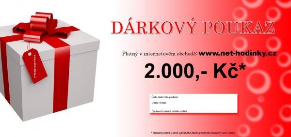 Dárkový poukaz 2000,- Kč s DOPRAVOU DÁRKU ZDARMA na eshopu www.net-hodinky.cz\r\rDárkový poukaz na nákup zboží v hodnotě 200 Kč na eshopu www.net-hodinky.cz\r\rMějte jistotu, že svým dárkem uděláte radost! Kupte svým milovaným dárkový poukaz a nechejte výběr na obdarovaném dle svého přání a vkusu. Zaručeně potěšíte a nezklamete špatným výběrem dárku!\r\rVlastnosti a výhody Dárkového poukazu:\r \r* dárkový poukaz má platnost 6 měsíců\r* dárkové poukazy nabízíme v hodnotách 200, 500, 1000 a 2000 Kč\r* dárkový poukaz lze kombinovat (možnost nákupu dražšího zboží s doplatkem ceny)\r* dárkový poukaz v hodnotě 2000 Kč a více nabízíme s DOPRAVOU DÁRKU ZDARMA\r* dárkový poukaz Vám zašleme obratem v elektronické podobě ve formátu pdf, každý voucher v samostatném souboru.\r\rK jakým příležitostem využít Dárkový poukaz:\r\r* "na Ježíška"\r* k narozeninám\r* k svátku\r* k životnímu jubileu\r* jako svatební dar