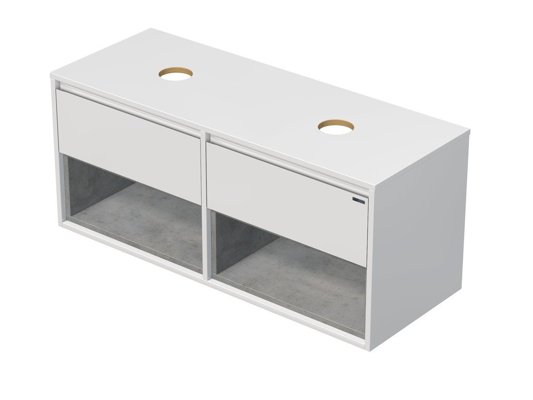 Zobrazit historii ceny Emmy Design EMMY 120 cm bílá/beton s dvěma zásuvkami a 2x otevřenou nikou, pro umyvadla na desku (A0536/F186)