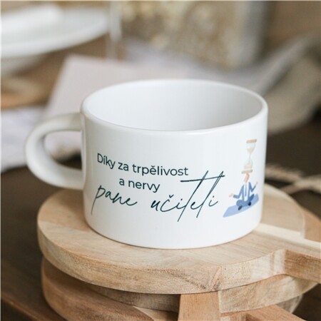 Originální keramický hrníček s bílou glazurou, nápisem "Díky za trpělivost a nervy, pane učiteli."