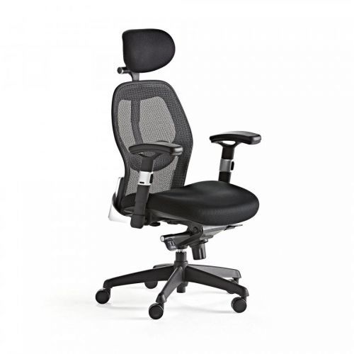 Kancelářská židle s opěradlem ze samonosné síťoviny. Je vybavena synchronní technologií s houpací funkcí uzamykatelnou v 5 polohách. Tato elegantní kancelářská židle s opěradlem z černé samonosné síťoviny se dokonale hodí do každé moderní kanceláře. Pohodlný sedák je bohatě čalouněný a polstrovaný odolným potahem z černé textilie, zatímco opěradlo je ze vzdušné síťoviny a poskytuje dobrou oporu zádům a konstantní proudění vzduchu. Kříž podnože je ocelový, černě lakovaný s detaily v barvě hlíniku. Součástí židle jsou nastavitelné područky a opěrka hlavy pro dobrou oporu těla. Židle je opatřena kolečky na tvrdé podlahy. Díky svým ergonomickým vlastnostem se židle hodí i pro 8 hodin sezení denně. Synchronní technologie zajišťuje přesně koordinované pohyby sedáku a opěradla, zatímco houpací funkce zaručuje možnost uzamčení opěradla v 5 polohách nebo jeho osamostatnění. Tato mechanika přispívá k ergonomické poloze těla a podpoře krevního oběhu. Výšku sedáku si můžete snadno nastavit podle vlastní tělesné výšky tak, aby vaše chodidla pevně spočívala na zemi. Židli doporučujeme doplnit o opěrku nohou a podložku pro ochranu podlahy před zbytečným opotřebením způsobeným kolečky a obuví.