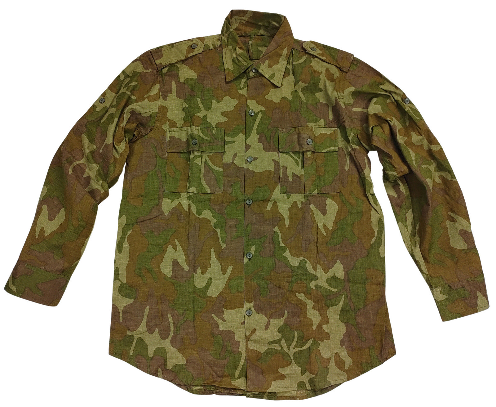 Originální bojová bavlněná košile s dlouhým rukávem, opatřena knoflíkem pro zkrácení rukávů srolováním. Ve světlém lesním „listovém“ maskování M-1990, pocházející z výstroje rumunské armády.