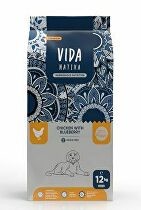 Vida Nativa Freedom Chicken with BlueberryKuře s borůvkamiKompletní krmivo pro štěňata středních a velkých plemen a pro březí nebo kojící feny.Složení: dehydratovaný kuřecí protein (20 %), brambory, hrachový škrob, vykostěné kuře (11 %), kuřecí tuk, hydrolyzovaný drůbeží protein, sušená vejce, kuřecí chrupavky (zdroj glukosaminu a chondroitin sulfátu), lněné semínko, rybí tuk (z lososa), borůvky (4 %), brokolice (4 %), chřest, špenát, sušené cukrovarské řízky, vojtěšková mouka, hrachová vláknina, uhličitan vápenatý, fosforečnan vápenatý, chlorid draselný, chlorid sodný, sušené pivovarské kvasnice, inulin z čekanky (0,4 %), kvasnicový extrakt (zdroj mannan-oligosacharidů) (0,2 %), frukto-oligosacharidy (0,2 %), Ascophyllum Nodosum, sušená máta, měsíček lékařský, slupky a semena Psyllium, yucca schidigera.Doplňkové látky na kg – nutriční doplňkové látky: vitamin A 18000 UI; vitamin D3 1800 UI; vitamin E, 220 mg; vitamin C 180 mg; niacinamid 54 mg; D-panthenol 22,5 mg; vitamin B2 11,2 mg; vitamin B6 6,7 mg; vitamin B1 11,2 mg; biotin 0,54 mg; kyselina listová 0,54 mg; vitamin B12 0,09 mg; cholinchlorid 2520 mg; zinek (jako zinečnatý chelát glycinu, hydrát): 94,00 mg; mangan (jako chelát manganu a glycinu, hydrát): 20,00 mg; Železo [jako železnatý chelát glycinu, hydrát]: 72,00 mg; Měď [jako měďnatý chelát glycinu, hydrát]: 14,00 mg; Jód (jod