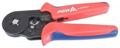 Elektrikářské kleště na krimpování – lisování elektrických dutinových konektorů (dutinek), tzv. „krimpovačky", čtyřhranné čelisti, se samo nastavovacím systémem – ASTA A-MCP237. Precizní krimpovací – lisovací nástroj s možností nastavení upínací síly. Čtyřhranný upínací profil s automatickým přizpůsobením průřezu lisovacího pouzdra. Možnost vynuceného odemčení zámku. Ergonomická rukojeť zaručuje pohodlnou práci a patřičný přenos síly při lisování. Čtyřhranné čelisti zajišťují perfektní nalisování dutinky do čtvercového tvaru. Technické údaje · Pro dutinky průměrů: 0,25 – 10 mm2 (AWG 23–7) · Délka kleští: 175 mm · Hmotnost: 300 g