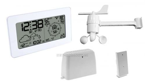 Popis zboží:\r\rMeteorologická stanice zobrazuje čas řízený krystalem, měří barometrický tlak, vnitřní teplotu a relativní vlhkost, pomocí bezdrátových čidel měří vnější teplotu a relativní vlhkost, rychlost a směr větru, dešťové srážky, zobrazuje hodnotu Wind Chill (teplotu pociťovanou vlivem větru), rychlost nárazů větru, má dva budíky\r\r- displej o velikosti 165 x 75 mm\r- celkové rozměry (v x š x h) 212 x 120 x 17 mm bez stojánku \r- velikost číslic na LCD displeji: čas 25 mm, datum 6 mm, barometrický tlak 9,5 mm, teplota a relativní vlhkost 9 mm, srážky 9 mm, rychlost větru 10 mm, náraz větru 8 mm, Wind Chill 4,5 m\r- 5 animovaných ikon předpovědi počasí (slunečno, polojasno, zataženo, déšť, sněžení)\r- varování možnosti náledí\r- měření absolutního barometrického tlaku\r- šipka tendence vývoje barometrického tlaku\r- zobrazení barometrického tlaku v hPa, inHg, nebo mb\r- zobrazení hodnot vnitřní teploty a relativní vlhkosti\r- zobrazení hodnot vnější teploty a relativní vlhkosti\r- možnost použití celkem dvou bezdrátových čidel pro měření teploty a relativní vlhkosti \r- zobrazení teploty ve °C, nebo °F\r- zobrazení rychlosti větru v km/h, mph, nebo uzlech\r- zobrazení směru větru (16 směrů)\r- zobrazení hodnoty wind chill\r- zobrazení hodnoty nárazu větru\r- zobrazení celkového množství dešťových srážek \r- paměti na maximální a minimální naměřené hodnoty vnější a vnitřní teploty a relativní vlhkosti a rychlosti větru\r- přenos dat z čidel na frekvenci 433 MHz\r- dosah signálu bezdrátových čidel až 100 m v otevřeném prostoru\r- automatické vyhledání signálu bezdrátových čidel\r- dosah signálu čidla pro měření teploty a vlhkosti až 50 m v otevřeném prostoru\r- hodiny řízené krystalem\r- datum \r- dva budíky s funkcí opakovaného buzení snooze \r- ikony indikace slabých baterií\r- 12ti, nebo 24 hodinový formát zobrazení času\r- možnost postavení, nebo zavěšení hlavní jednotky\r- 3 ks baterií AA (tužkové)\r- napájení anemometru 2 ks baterií AA (tužkové)\r- napájení srážkoměru 2 ks baterií AA (tužkové)\r- napájení čidla pro měření teploty a rel. vlhkosti 2 ks baterií typ AAA 1,5V (mikrotužky)\rBezdrátová čidla\r\r- čidla mají voděodolné provedení\r- bezdrátové čidlo pro měření teploty a vlhkosti\r- bezdrátový anemometr pro měření rychlosti větru a směru větru\r- bezdrátový srážkoměr\r\rParametry:\r\rRozsah měření vnitřní teploty / tolerance 0°C až +50°C ±1°C\rRozlišení vnitřní teploty 0,1°C\rRozsah měření vnější teploty / tolerance -50°C až +70°C ±1°C\rRozlišení vnější teploty 0,1°C\rRozsah měření vnitřní rel. vlhkosti / tolerance 20% až 95% ±5%\rRozlišení vnitřní rel. vlhkosti 1%\rRozsah měření vnější rel. vlhkosti / tolerance 20% až 95% ±5%\rRozlišení vnější rel. vlhkosti 1%\rRozsah měření bar. tlaku / tolerance 800 mb/hPa až 1050 mb/hPa ±5hPa\rRozlišení měření bar. tlaku 1 mb/hPa\rRozsah měření rychlosti větru / tolerance 0 až až 160 km/h\rRozlišení rychlosti větru 1 km/h\rMěření směru větru 0°až 360° , 16 pozic\rMěření dešťových srážek ano, celkové 0 až 999.9 mm\rRozlišení dešťových srážek 0,1 mm\rGraf ne\rFáze Měsíce ne\rPrincip předpovědi počasí na základě změn bar. tlaku\rNastavení nadmořské výšky ne\rPočet ikon předpovědi počasí 5\rDosah signálu bezdrátového čidla až 100 m v otevřeném prostoru\rInterval přenosu dat cca 75 s\rFrekvence přenosu bezdrátových čidel 433 MHz\rPočet kanálů 2\rDélka vodiče teplotního čidla -\rPaměť na max a min naměřené hodnoty ano, vnější a vnitřní teploty a relativní vlhkosti, rychlosti větru\rVnitřní paměť ne\rAlarm horní a dolní meze teplot ne\rAlarm horní a dolní meze rel. vlhkosti ne\rIndikace námrazy ano, pod 4°C zobrazením ikony\rIndikace možnosti bouřek ne\rIndex tepelné pohody ne\rZobrazení hodnoty rosného bodu ne\rDatum ano\rČas ano, řízený krystalem\rFormát času 12/24 hodin\rBudík ano, 2 budící časy\rOpakované buzení (Snooze) ano, po 8 minutách\rČasová zóna ne\rRozměry displeje hlavní jednotky 165 x 75 mm\rVelikost číslic - hlavní jednotka čas 25 mm, datum 6 mm, barometrický tlak 9,5 mm, teplota a relativní vlhkost 9 mm, srážky 9 mm, rychlost větru 10 mm, náraz větru 8 mm, Wind Chill 4,5 mm\rOsvětlení displeje hlavní jednotky ne\rDisplej bezdrátového čidla ne\rRozměry displeje bezdrátového čidla -\rNapájení hl. jednotka 3 ks baterie 1,5 V typ AA (tužkové, nejsou součástí dodávky)\rčidlo pro měření teploty a vlhkosti 2 ks baterie 1,5 V typ AAA (mikrotužkové, nejsou součástí dodávky)\ranemometr 2 ks baterie 1,5 V typ AA (tužkové, nejsou součástí dodávky)\rsrážkoměr 2 ks baterie 1,5 V typ AA (tužkové, nejsou součástí dodávky)\rCelkové rozměry hl. jednotka 212 x 120 x 17 mm\rčidlo pro měření teploty a vlhkosti 49 x 110 x 33 mm\ranemometr 320 x 200 x 134 mm\rsrážkoměr 156 x 95 x 60 mm\rVáha hl. jednotka 218 g (bez baterií)\rčidlo pro měření teploty a vlhkosti 46 g (bez baterií)\ranemometr 136 g (bez baterií)\rsrážkoměr 206 g (bez baterií)\rBarva hl. jednotka bílá\rčidlo pro měření teploty a vlhkosti bílé\ranemometr bílý\rsrážkoměr bílý\rMožnost postavení / zavěšení hl. jednotka ano / ano\rčidlo pro měření teploty a vlhkosti ano / ano\ranemometr ne / ano (stožár, zeď)\rsrážkoměr ano / ne