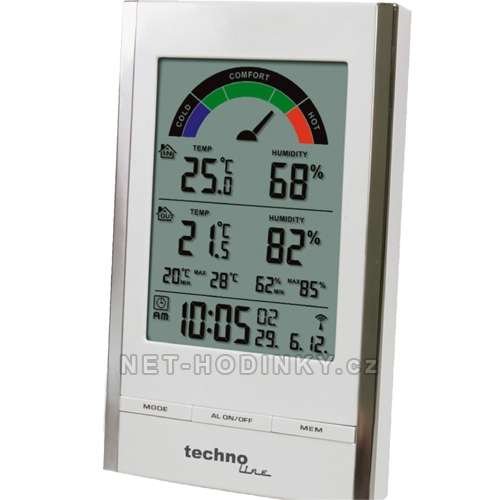 Rádiem řízené hodiny\r\rDatum a ukazatel dne v týdnu (8 jazyků)\r\rVnitřní a vnější teplota\r\rVnitřní a venkovní vlhkost\r\rZáznam MIN / MAX teploty\r\rBarevný ukazatel komfortu\r\rAlarm s funkcí Snooze\r\rPodsvícení LCD displeje\r\rindikátor vybité baterie\r\rMontáž na stěnu nebo stůl stojící\r\rVysílač TX80TH\r\r\rStanice:\r\rRozměry: 92 x 45 x 152 mm\r\rNapájení: 3 x AA Mignon LR06 (nejsou součástí dodávky)\r\r\r\rVysílač:\r\rRozměry: 55 x 20 x 111 mm\r\rNapájení: 2 x AAA LR03 (nejsou součástí balení)\r\rVysílací frekvence: 433MHz\r\rPřenosová vzdálenost: 100m ve volném prostoru\r