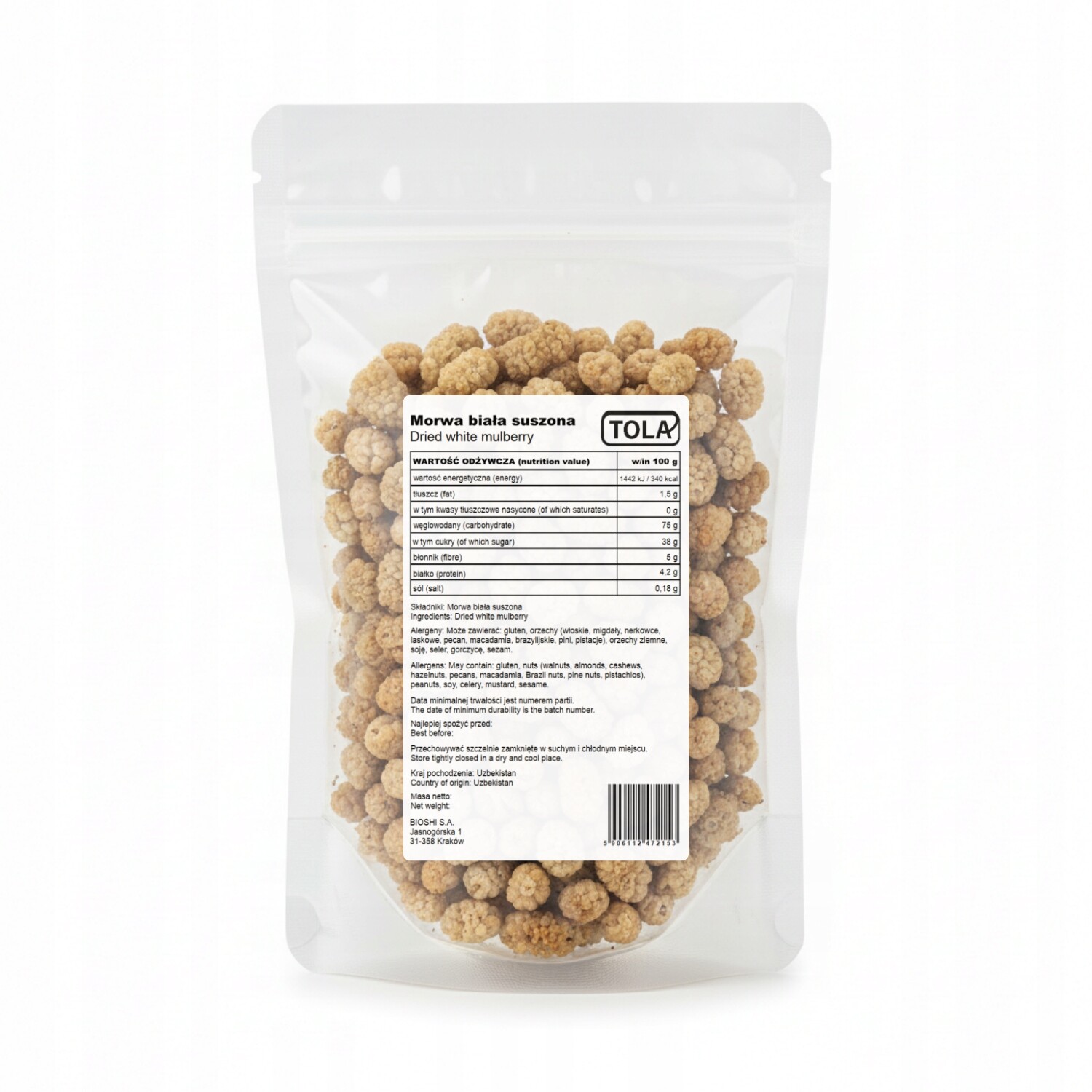 Moruše bílá bez pecek – přirozená sladkost ve vaší kuchyni!Objevte jedinečnou chuť moruše bílé bez pecek od značky TOLA – ovoce, které kombinuje jemnost, přirozenou sladkost a bohatství nutričních hodnot. Je to ideální volba pro lidi, kteří oceňují zdravé a chutné občerstvení, stejně jako pro ty, kteří chtějí obohatit své pokrmy o jedinečnou složku. Moruše je ovoce, které zaujme svou jemností a všestranností a díky absenci pecek je velmi pohodlné na používání. Přineste do své kuchyně produkt, který nejen chutná, ale také podporuje vaše zdraví!Moruše bez pecek je opravdovým pokladem přírody. Bohatá na vláknina, vitamín C a přírodní cukry představuje skvělou alternativu k tradičním sladkým svačinkám. Díky její jemné struktuře a jemné chuti se skvěle hodí k mnoha pokrmům. Navíc nedostatek pecek je zárukou pohodlí a komfortu při konzumaci. Jedná se o produkt, který kombinuje jednoduchost, přirozenost a nejvyšší kvalitu – vše, co potřebujete, aby vaše každodenní jídla byla ještě lepší.Proč stojí za to?Přírodní sladkost bez přidaného cukru – ideální pro lidi, kteří dbají o zdravou stravu.Všestrannost použití – skvělá pro dezerty, snídaně a svačiny.Vysoký obsah vlákniny a zdroj vitamínu C.Žádné pecky – pohodlí a komfort při používání.Přírodní složení ?