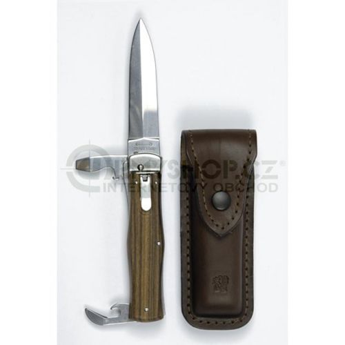 Vyhazovací nůž s tvarovanou rukojetí z hnědého dřeva a čepelí ve tvaru listu s jednostranným břitem Pomocí pojistky snadno ovladatelné palcem lze nůž skrytý v dlani kdykoliv pohotově otevřít a připravit k použití Nůž je jako dalšími nástroji vybaven otvírákem na konzervy a otvírákem na láhve Dodává se s koženým pouzdrem černé nebo tmavě hnědé barvy (dle aktuální nabídky) uzavíraným na druk. Pouzdro lze pomocí průvleku o šířce 42 mm zavěsit na opasek Rozměry čepele: délka 95 mm, šířka 23 mm Rozměry nože: otevřený: 215 x 27 x 21 mm; v zavřené poloze délka pouze 120 mm Hmotnost: 200 g Výrobce: Mikov, ČR