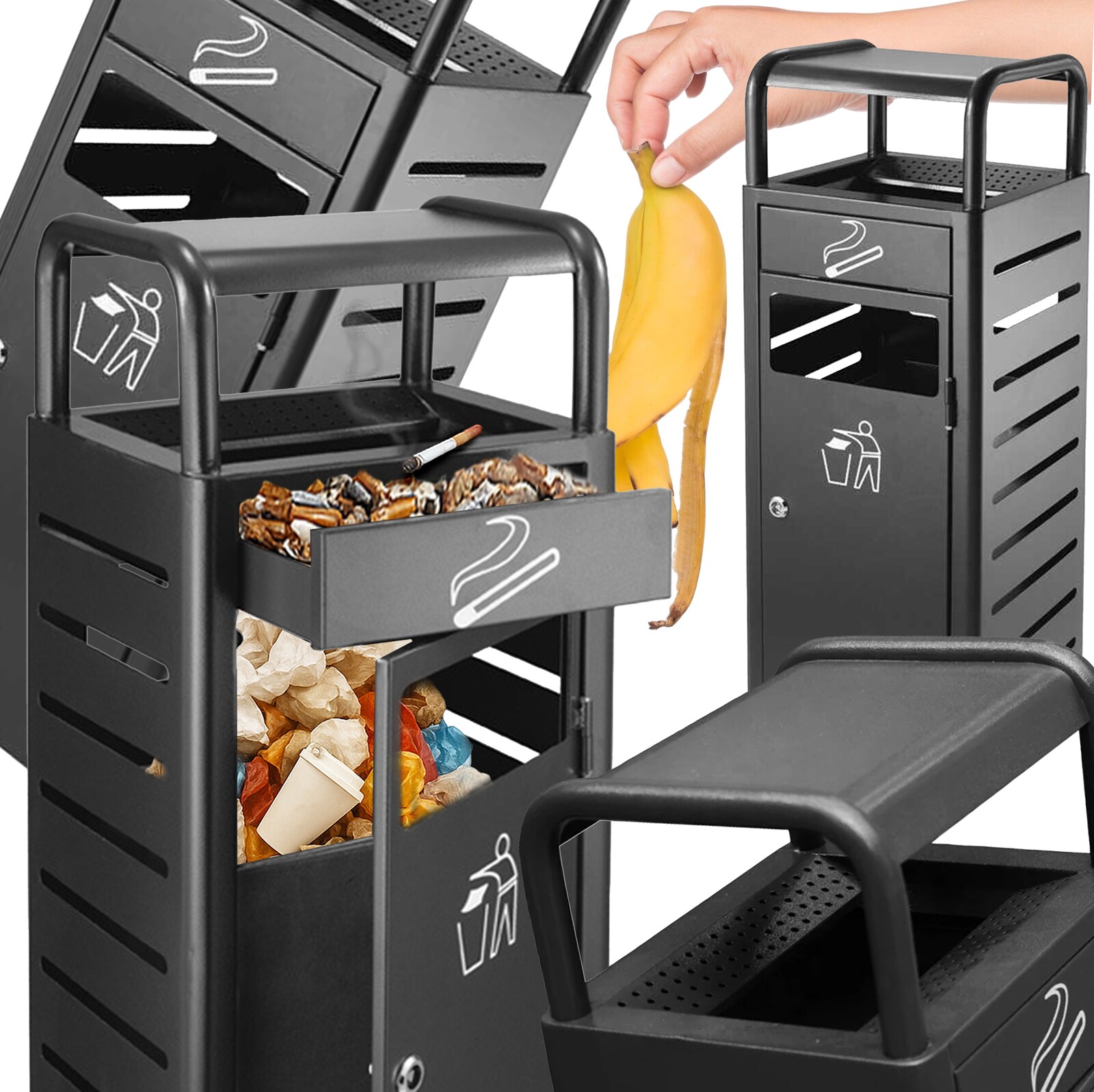 PROFESIONÁLNÍ odpadkový koš s popelníkemČerná barva | Odolná | Odolný vůči povětrnostním podmínkám ???????? Ideální pro: restaurace ???? | kanceláře ???? | terasy ???? | veřejná místa ???????? Postarejte se o pořádek, bezpečnost a estetiku svého prostoru!Představujeme vám moderní odpadkový koš s vestavěným popelníkem v elegantní černé barvě ????.Tento univerzální zásobník je řešením 2v1 – účinně sbírá odpad a eliminuje problém nedopalků ????. Díky pevné konstrukci a bezpečnostním prvkům se skvěle hodí jak uvnitř, tak i venku.Není to jen koš – je to prvek výzdoby a pohodlí, který obohatí každý veřejný, firemní nebo soukromý prostor.Vsaďte na kvalitu, funkčnost a styl! ✅Technická specifikaceVýška: 83 cm???? Šířka: 28 cm???? Hloubka: 33 cm???? Barva: Černá (matná, práškově lakovaná)???? Materiál: Silná ocel???? Vybavení: Popelník (kovový, vyjímatelný), zámek s klíčem, vnitřní nádoba☀ ???? Použití: Pro vnitřní i vnější použitíVLASTNOSTI PRODUKTU:1 Integrovaná PopelníkPopelník na vrcholu koše umožňuje pohodlné a hygienické zbavování se nedopalků.Zabraňuje rozsypání pop