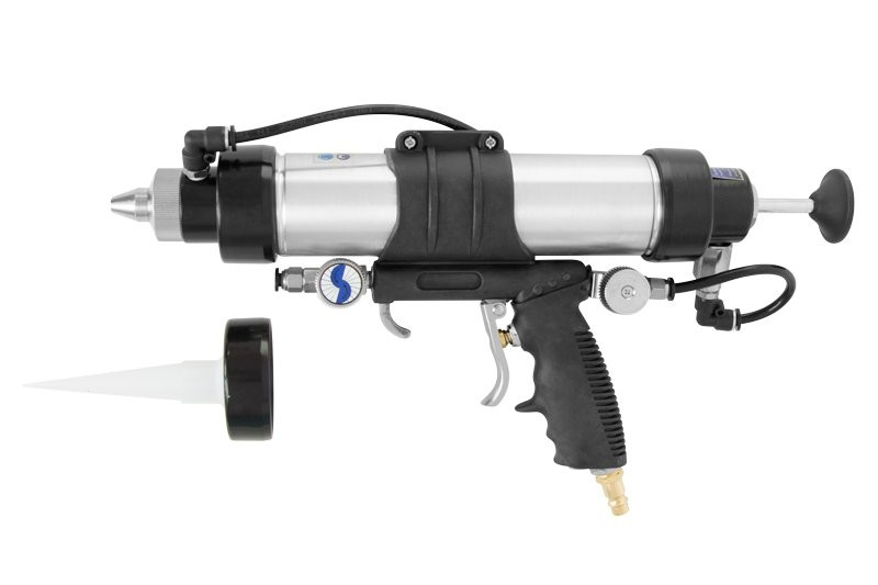 Profesionální pneumatická stříkací a vytlačovací pistole pro nanášení hmot stříkacích, těsnicích, tmelicích a lepicích v různých kartuších a fóliových/salámových sáčcích (silikonové, akrylové, polyuretanové a další hmoty). Takto lze kromě jiného utěsňovat sváry, různé mezery, vytvářet tzv. "housenky" shodné s prvovýrobou, nanášet lepidlo při montáži/lepení skel, nanášet rúzné hmoty v oblasti sanitární techniky, zhotovovat nástřiky s odlišnou strukturou/texturou (hrubší korálková, střední zvrásněná, jemnější nástřiková apod.), která obnovuje originální povrchovou úpravu například karosérií automobilů. S touto pistolí lze stříkat i spodní části vozidel. Je vybavena systémem pro zabránění výtoku/odkapávání materiálu po ukončení pracovního procesu. Není vhodná pro vysoce viskozitní lepidla.Pneumatická pistole má aluminiový zásobník ve tvaru válečku/trubice s předním i zadním víčkem. K pohodlnému držení a snadnější práci i v obtížněji přístupných místech slouží ergonomická rukojeť s měkkým krytem a spouští. Blok rukojeti, spouště a obou regulačních ventilů je na aluminiovém zásobníku posuvný, takže celou pistoli lze podle potřeby obsluhy perfektně vyvážit. Pneumatickou část tvoří vzduchový mechanismus, 3 trysky, vzduchové hadičky a přední a zadní otočný regulační ventil. Přední zajišťuje regulaci přídavného vz