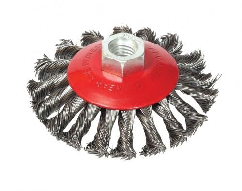 Rotační kartáč - miskový, provedení : COPY - patentovaný drát 0,5 mm - copy, se ani při extrémním zatížení nerozplétají, průměr 100mm, závit M14x2 mm, počet drátů: 900, délka drátu : 23 mm, max. přípustné otáčky: 12500 1/min, použití: odstranění barvy, rzi, otřepů, zbytků po svařovení, strusky, zdrsňování, čištění kovoých součástí, balení papírový box s eurootvorem. Instruktážní video