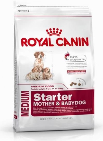 Royal Canin Dog Medium Starter Mother & BabydogRoyal Canin Starter Mother&Babydog je kompletní superprémiové krmivo určené pro štěňata a březí nebo kojící feny středních plemen.Vylepšené složení nabízí optimální poměr živin, které podporují správné trávení a posilují přirozenou obranyschopnost štěňat.Každá granule obsahuje jedinečnou kombinaci vitamínů, minerálů a potřebné množství bílkovin, které poskytují fence i štěňatům dostatek energie pro jejich růst.Krmivo lze také jednoduše namočit ve vodě na chutnou kaši, která usnadňuje přechod na pevnou stravu.Hlavní přednosti krmiva:Obsah a složení živin jsou přizpůsobeny vysokým energetickým nárokům na konci březosti a během laktaceVýživa podporuje přechod z mateřského mléka na pevnou stravuGranule se snadno rehydratují a získávají kašovitou konzistenciNavrženo tak, aby vyhovovalo potřebám feny a jejích štěňat během prvních fází životního cykluSloženíDehydrované drůbeží proteiny, rýže, živočišné tuky, pšeničný lepek*, kukuřice, řepné řízky, hydrolyzované živočišné proteiny, minerální látky, sójový olej, rybí tuk, fruktooligosacharidy, hydrolyzované kvasnice (zdroj mannanoligosacharidů a beta-glukanů) (0,30 %), olej z řas schizochytrium sp. (zdroj DHA), sůl kyseliny máselné, moučka z aksamitníku.