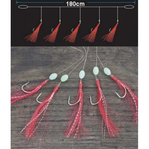 Systém pro lov makrel s pěti háčky. Červená barva je lákavá. Nad háčkem jsou fluorescenční korálky a na háčku jsou červené střapce. Součástí balení je EVA Board - pěnová deska na návazce.