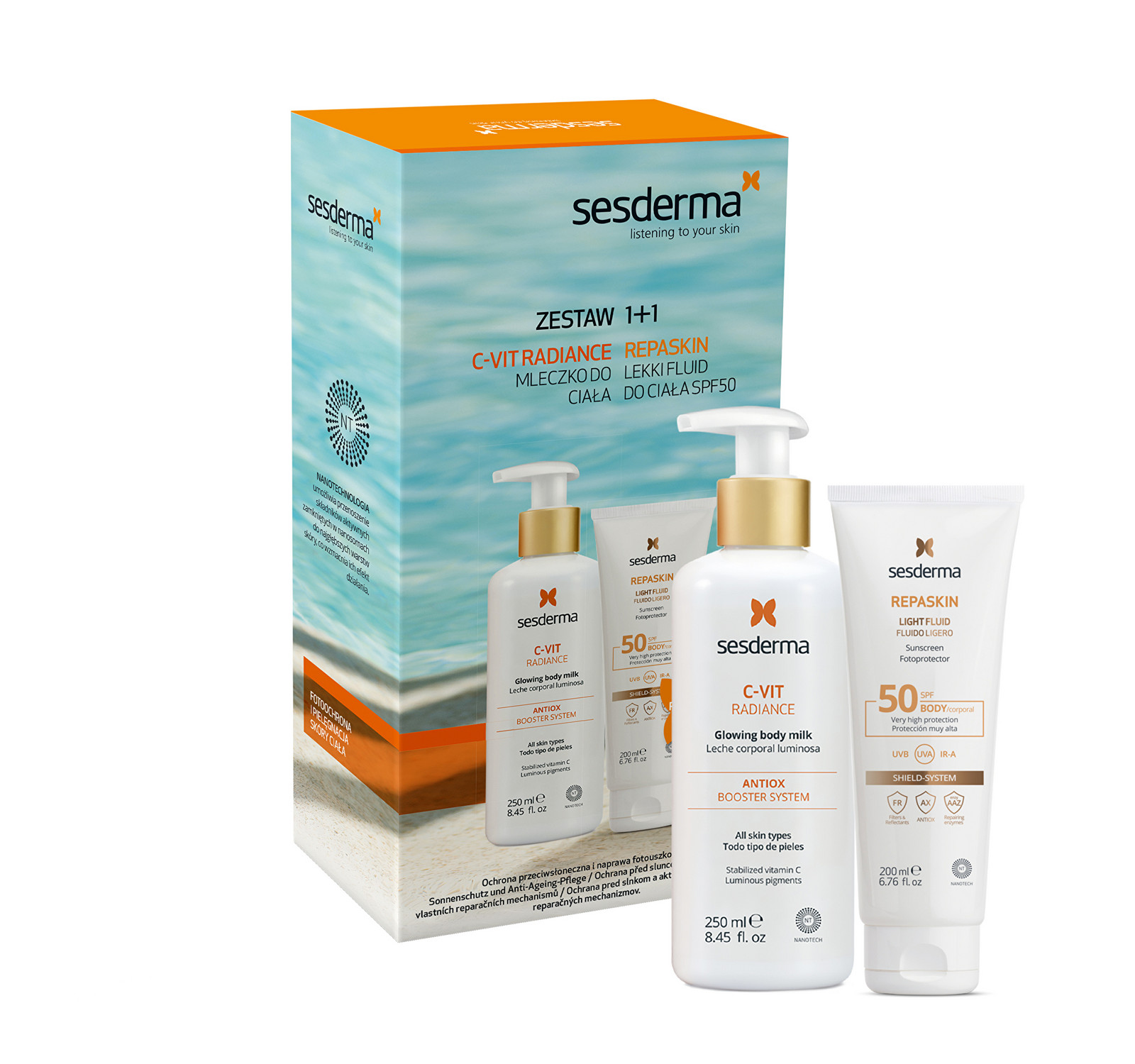 Tělové mléko 250 ml + REPASKIN LIGHT FLUID SPF50 200 ml Sada obsahuje: Hydratační tělové mléko s vitamínem C -VIT Radiance (Glowing Body Milk) 250 ml