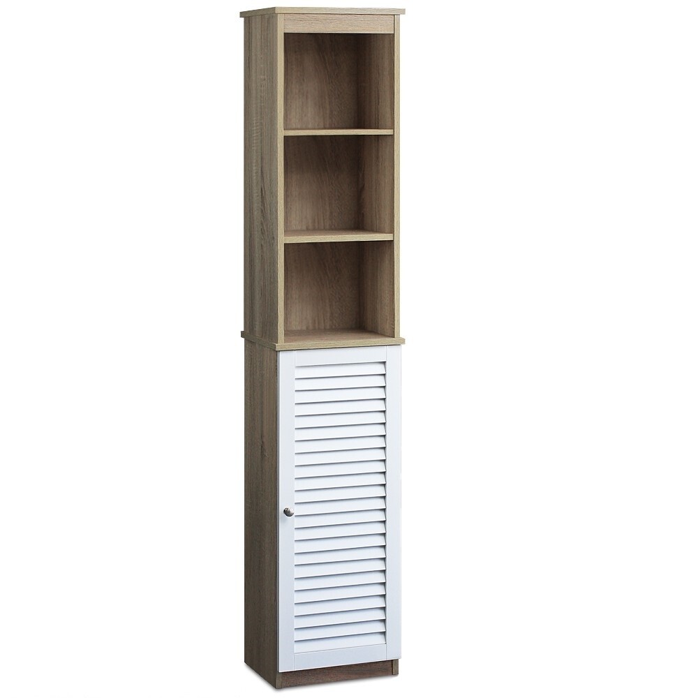 Stylová koupelnová skříňka poskytuje dostatek místa pro Vaše ručníky, kosmetiku a další vybavení do koupelny. Vysoká skříň je vyrobena z MDF v dekoru dřeva a má celkem 6 polic. Dvířka jsou lamelová v bílé barvě. Barva: hnědá / bíláMateriál: MDFRozměry: šířka: 34 cm hloubka: 26 cm výška: 170 cmHmotnost:19 kgDodáváno v demontu.