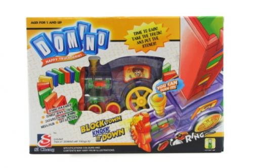 Stavěcí domino vláček obsahuje krásný červený vláček o velikosti cca 14 x 11 cm. Napájení na 2 AA baterie (nejsou součástí balení). Do vláčku se nasadí tyč,ve které je uloženo domino. Při jízdě domino vypadává z vláčku a staví se za sebou.Vláček svítí a cinká. Při nárazu změní směr jízdy a jede dál. Rozměry balení cca 33 x 23,5 x 8,5 cm. Věk 3+