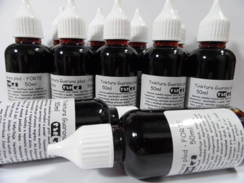 Tinktura z Guarany - FORTE 50 ml. Složení: lihový extrakt, Guarana plodGuarana tinkturaTinkturu je vhodné podávat ráno - maximálně však 3 - 4 krát denně ( max. až 20 kapek, což odpovídá polovině až celé malé kávové lžičce )Výrobek není z důvodu obsahu alkoholu vhodný pro děti, těhotné a kojící matky.Nedoplňuje pestrou a vyváženou stravu.NAŘÍZENÍ KOMISE (EU) č. 432/2012 (ze dne 16.května 2012), které platí od 14.12 2012nám neumožňuje popisovat všechny účinky doplňků na lidský organismus.Informace v obsahu tohoto letáčku byly získány z veřejně dostupných zdrojů ( herbáře a učebnice biologie ) . HERBÁŘ:Je využívána proti bolesti, horečkám a křečím. Účinně pomáhá při tlumení bolesti u migrén, spolehlivě odbourává kocovinu. Guarana je vysoce efektivní stimulant, obsahuje dvojnásobné množství kofeinu v porovnání s kávou. Obsahuje látky, které uvolňují kofein i další stimulující látky postupně a rovnoměrněji - 6 až 9 hodin a šetrněji než káva. Doporučuje se smíchat guaranu s citrónem, protože zlepšuje její účinky. Guarana zajišťuje celkovou regeneraci a vitalizaci organismu, odstraňuje fyzickou i psychickou únavu, zvyšuje vytrvalost, zlepšuje mentální funkce, má povzbuzující účinky a pozitivní vliv na naši koncentraci. Zlepšuje krevní oběh, brání usazování cholesterolu a výborně se uplatní při poruchách zažívacího ústrojí. Analgeticky působí při bolestivé menstruaci, celkově zmírňuje bolest a pomáhá snášet vysoké venkovní teploty. Guarana je vhodná pro celkovou rekonvalescenci po dlouhých nemocech. Kofein v guaraně působí také močopudně, obsažené třísloviny léčí lehká průjmová onemocnění. V homeopatii se podává při nervovém vyčerpání a bolestech hlavy. Guarana je zdravější alternativa kávy, nehrozí žádné žaludeční či srdeční potíže nebo spánkové poruchy. Guarana je drogou se všemi kladnými vlastnostmi kofeinu, který lze využít ke krátkodobému odstranění únavy, zlepšení duševní výkonnosti a potlačení pocitu hladu.----------Guarana pomáhá bojovat proti únavě, zbystřuje mysl, zlepšuje koncentraci, soustředění a paměť. Napomáhá proti depresím, úzkosti a harmonizuje centrální nervovou soustavu. Napomáhá při bolestech hlavy a zklidňuje příznaky migrény. Má analgetické, antioxidační, antibakteriální a hyperglykemické účinky. Guarana detoxikuje krev, likviduje volné radikály a napomáhá snižovat krevní tlak. Guarana též snižuje chuť k jídlu. Po delším užívání může omlazovat pleť a může pomoci při srdečních problémech. Miliony Brazilcům napomáhá překonat únavu z tepla a v Peru se mimo jiné užívá na vysoký krevní tlak, migrénu nebo revamtismus.Guarana je velmi oblíbeným společníkem studentům, kteří mají před zkouškou dospělosti či před náročným zkouškovým obdobím a lidem jejichž výplata se přímo úměrně odvíjí od jejich výkonu. Guarana totiž působí jako oáza na mozek, dokáže zrychlit mozkové pochody, zlepšit soustředěni, paměť a zbystřit mysl. Guarana též pomáhá posilnit nervy. Mnoho studentů si účinky pochvalují a považují její užívání téměř za nutnost.Aby byla guarana opravdu účinná, je důležité splnit tyto podmínky. Preparát by se měl užívat nejlépe každé ráno ihned po probuzení, pokud se cítíte unavení nebo vyčerpaní. ! Pozor kofein je na seznamu dopingových látek !Díky obsahu theofylinu a theobrominu působí mnohem déle (až 5 hodin ) a účinek není tak agresivní.