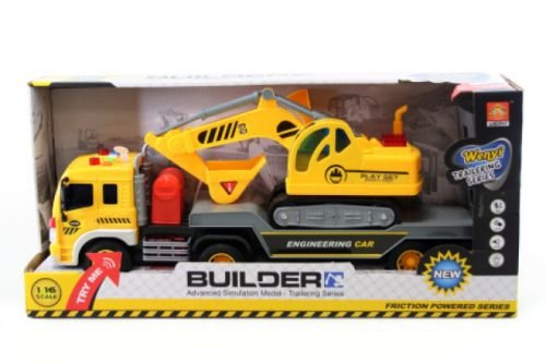 auta. Velký tahač po stisknutí 4 tlačítek na kapotě vydává zvuky a svítí. Rozměr tahače cca 38 x 10 + sklopná plošina. Rozměr balení cca 42 x 19 x 11,5 cm. Měřítko 1:16. Napájení na knoflíkové baterie (součástí balení). Věk 3+
