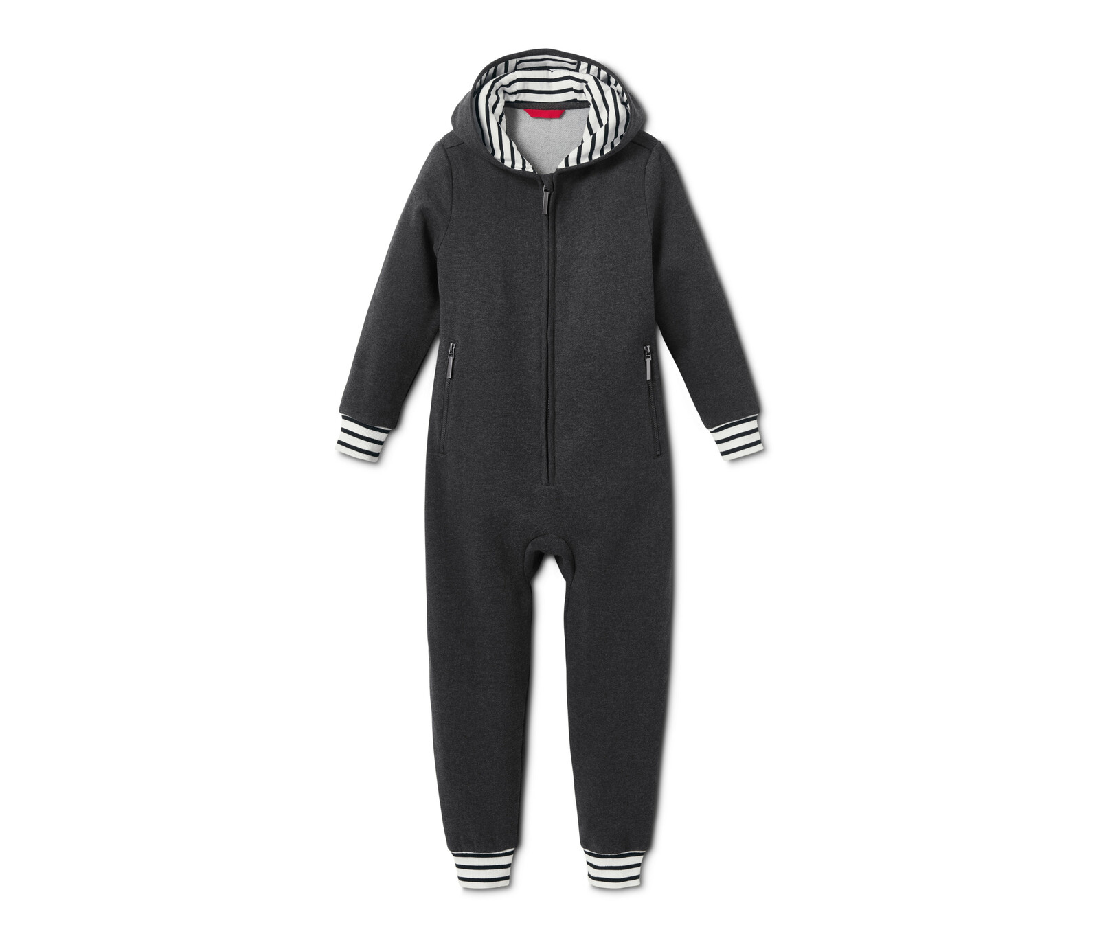 Dětský domácí overal Barva: Tmavě šedá s melírem a proužkovanými detaily Materiál: 80 % bavlna (Cotton made in Africa), 20 % polyester Rozměry: Vnitřní délka nohavic cca 63 cm (vel. 146/152) Jiná upozornění: Doporučení týkající se velikosti/věku: Vel. 122/128 (cca 6–8 let) Vel. 134/140 (cca 8–10 let) vel. 146/152 (cca 10–12 let) vel. 158/164 (cca 12–14 let) Vel. 170/176 (cca 14–16 let) Z měkké biobavlny Teplákovina – se zdrsněnou vnitřní stranouS kapucí a bočními kapsami na zipZip s ochranou bradyŽebrované lemy