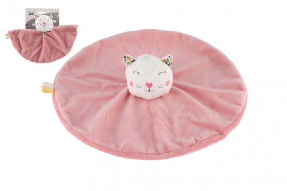 Teddies Kočka usínáček chrastítko plyš 25x25cm růžová na kartě v sáčku 0+