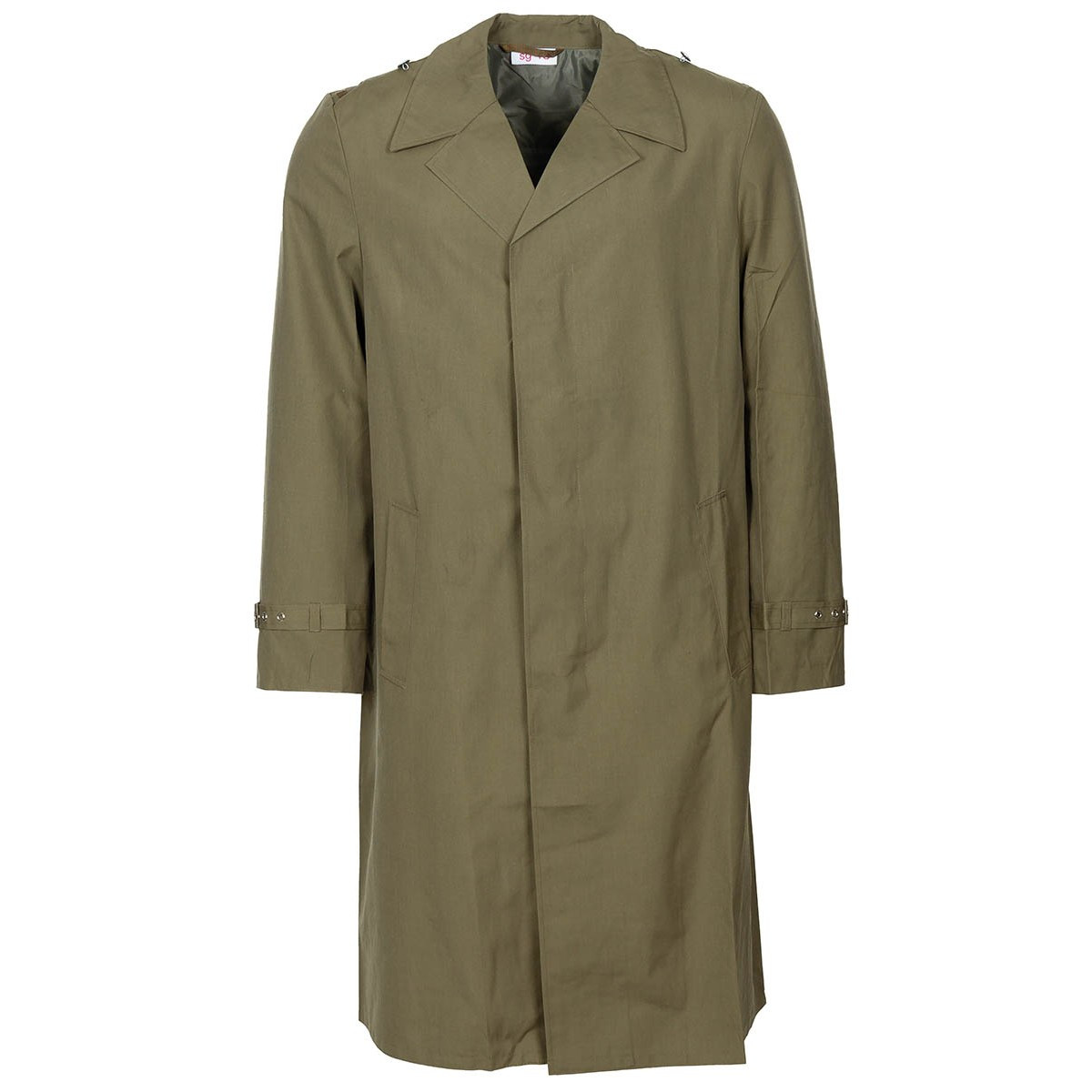 Originální nepromokavý vrchní plášť do deště pro pánskou uniformu východoněmeckého vojáka. Jednořadé zapínání s nastavitelnými rukávovými manžetami a opaskem s kovovou stříbřitou sponou.