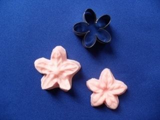 Opět duble květ ze silikonu a kovová vykrajovačka. Postup následující: tence vyválenou modelovací hmotu (rychle schnoucí) vykrojíme a vložíme na jednu silikonovou formu, přitlačením druhé formy docílíme oboustranné žilkování a prohnutí květu. I zde platí, pro snadnou výrobu formu jemně vytřeme štětcem namočeným v jemném moučkovém cukru (škrobu apod.), ve formě nesmí zůstat nánosy pudru. Vytlačený květ - nebo snad zmáčknutý květ - ve formě necháme mírně podchladit, následně vyjmeme a dáme dovyschnout do formovače. Samozřejmě, že můžeme použít obarvenou hmotu nebo i základní bílou. Obarvenou dotónujeme pudrovými barvami, bílou můžeme libovolně tónovat pudrovkami, fixami apod. Množství - sada, velikost pr.40mm