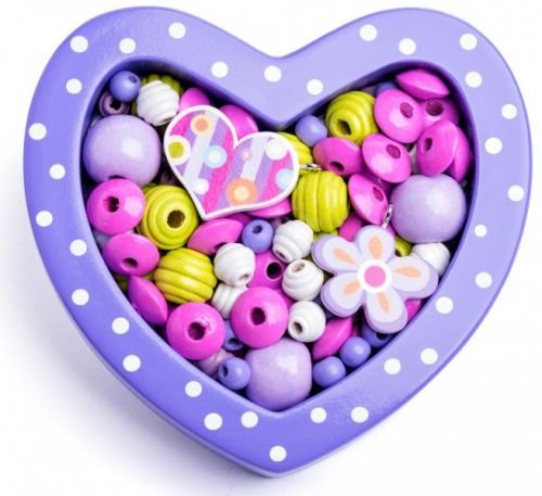 Korálky jsou vyrobeny z lakovaného dřeva v krásné krabičce ve tvaru srdíčka. Najdete zde korálky v barvách: bílé, zelené, růžové a odstínech fialové. Sada obsahuje také dva větší přívěsky s háčky ve tvaru květiny a srdíčka.