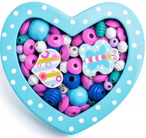 Toto srdíčko obsahuje velké množství klasických i soustružených korálků a přívěsků různých tvarů a velikostí a také tenké tkanice s koncovkou k provlékání v převážně modrých a růžových odstínech Kreativní