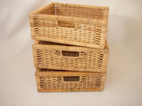 Set tří kusů zásuvek s dřevěnou kostrou a výpletem z přírodního ratanu.