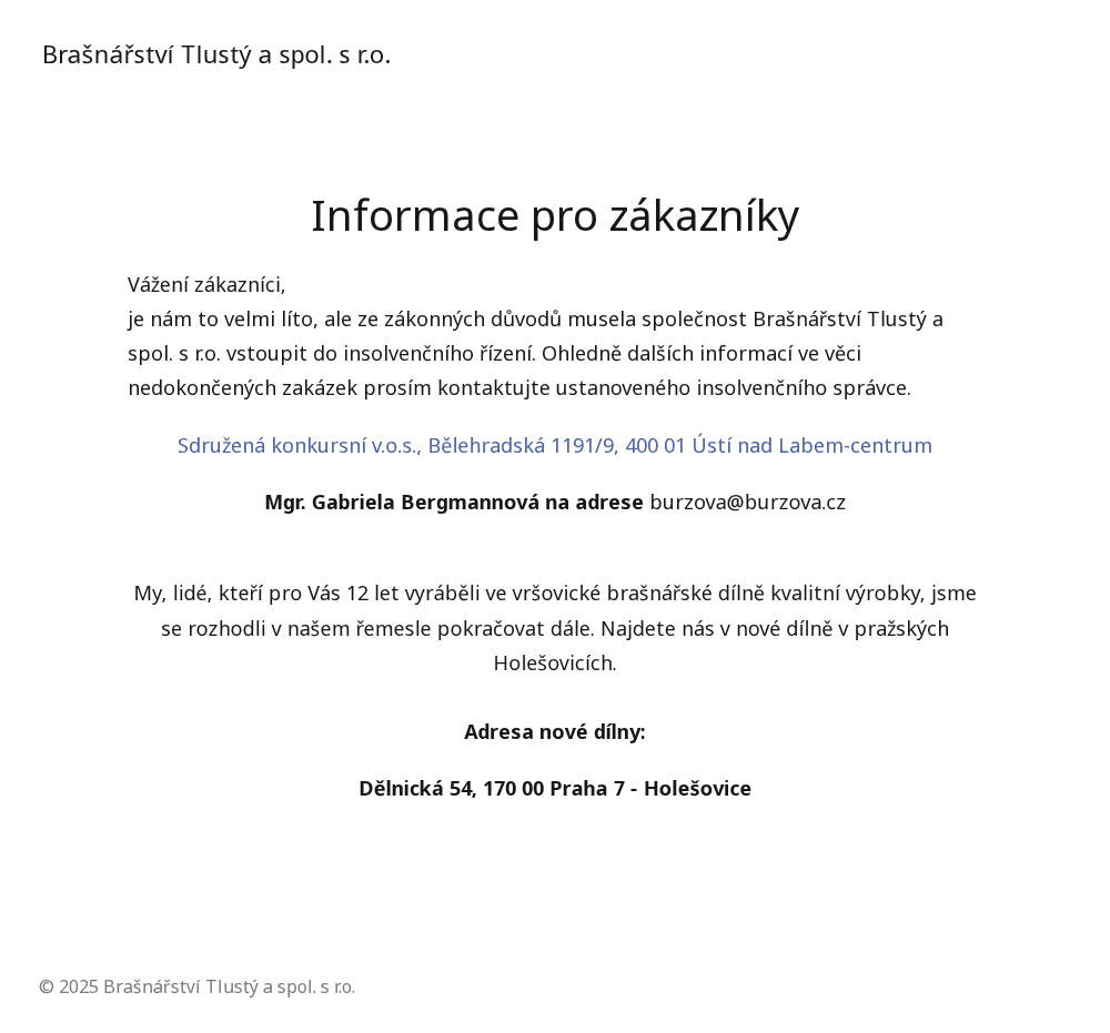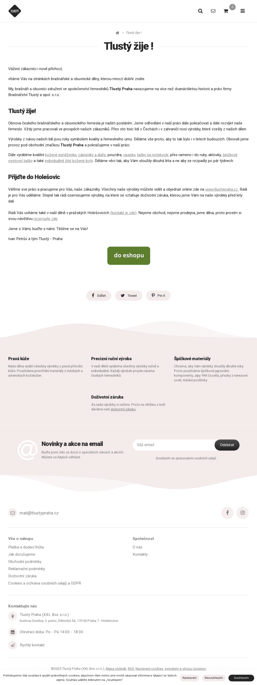 Historie Brašnářství Tlustý a spol. se píše od roku 1981. Během následujících let se z něj stala špička ve svém oboru a Vy tak můžete nakupovat jedinečné kožené produkty přesně podle Vašich požadavků. Manufakturní výroba si zakládá na maximální kvalitě a zpracování včetně splnění nejnáročnějších požadavků klienta.