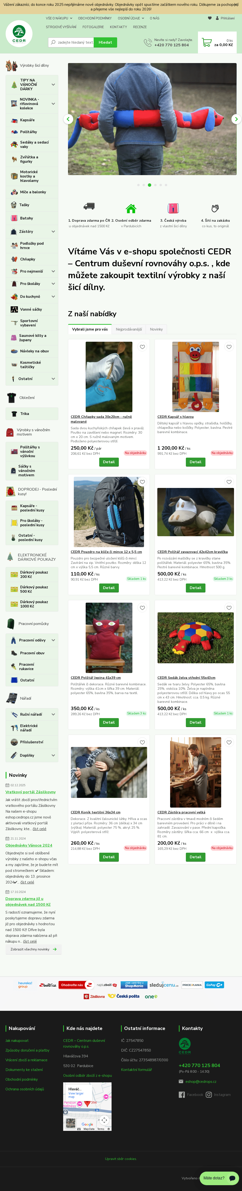CEDR – Centrum duševní rovnováhy o.p.s., dříve CEDR Pardubice o.p.s., poskytuje již od r. 1994 sociální služby lidem s duševním onemocněním v Pardubicích a od r. 2010 v Ústí nad Orlicí. V šicí dílně šijeme hračky, polštáře, kapsáře, tašky, baťohy, zástěry, chňapky, saunové kilty, návleky na obuv, pracovní oděvy a pomůcky, vyšíváme, provádíme opravy oděvů, šijeme na zakázku dle požadavků zákazníka. Výrobky šicí dílny nabízíme na vlastním e-shopu.