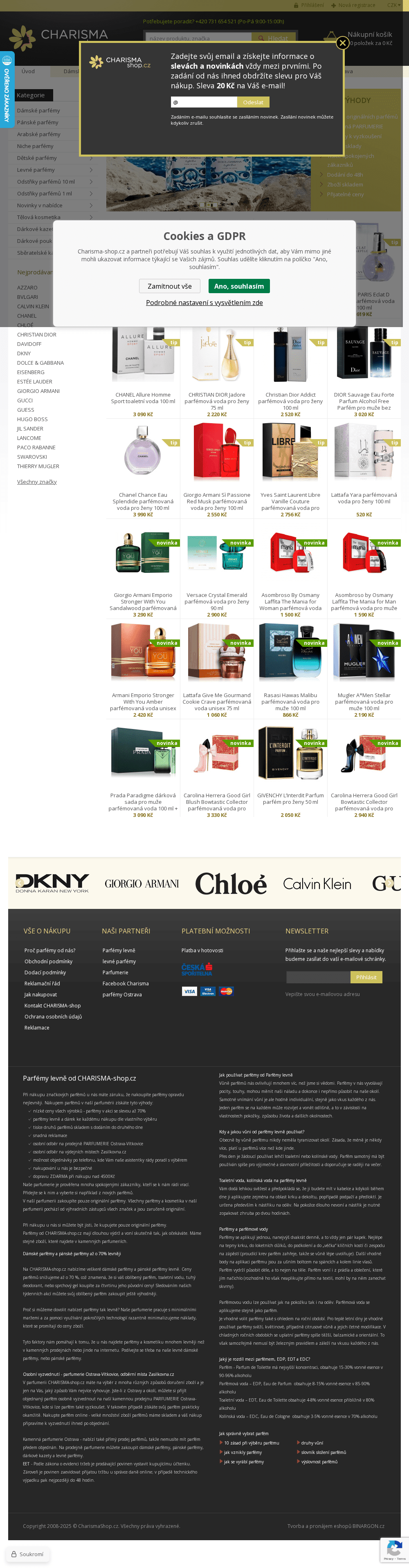 Kamenná a internetová parfumerie ověřena mnoha spokojenými zákazníky. Značkové parfémy se slevou až 60%! V parfumerii Charisma-shop.cz naleznete nejen dámské parfémy, ale i pánské parfémy. Ke každé objednávce možnost vybrat si dárek ZDARMA!