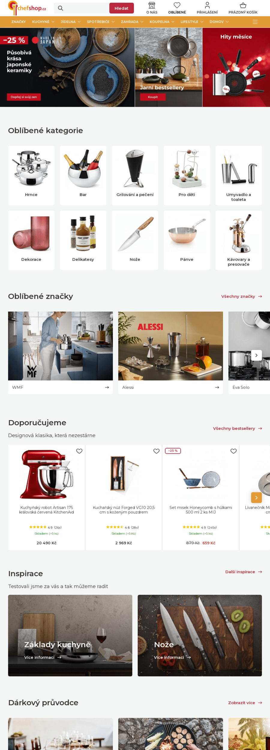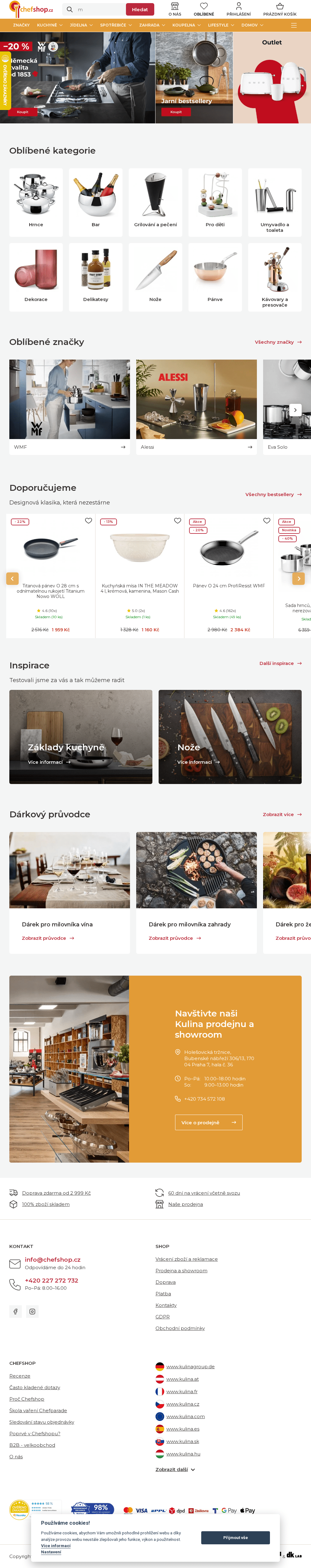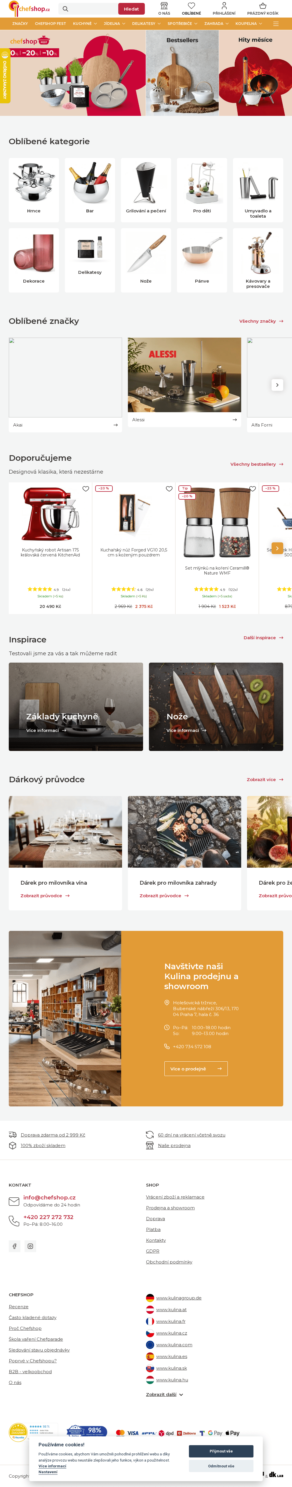 Chefshop je e-shop Školy vaření Chefparade a jako takový se specializuje na potraviny a produkty, které jsou vhodné pro přípravu exotických pokrmů připravovaných na kurzech vaření. Naše nabídka je ale mnohem širší. Najdete v ní různé zahraniční delikatesy, nápoje a speciality asijské kuchyně, hrnce, pánve, nože a další pomocníky do kuchyně známých značek a také vše na pečení včetně kucyhňských spotřebičů. V neposlední řadě si pak můžete vybrat z široké nabídky talířů, misek, hrnečků a dalších produktů na váš stůl včetně unikátní a nádherné keramiky Made in Japan, kterou nikde jinde nenajdete, neboť jsme jediným výhradním dovozcem této značky do Evropy. Přijďte nás navštívit do naší nové prodejny, která se otevírá 12.11.2016 v Pražské holešovické tržnici v hale č.36 a prohlédněte si vše na vlastní oči!