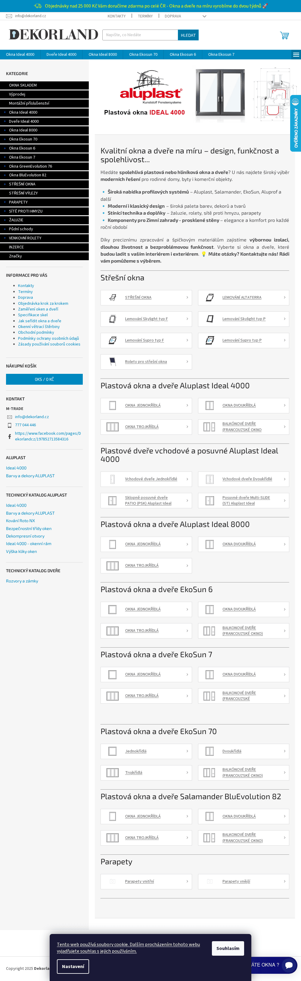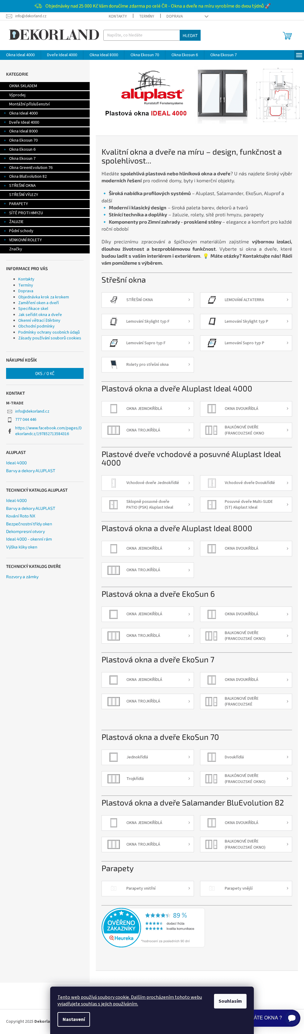 Plastová okna EkoSun 3D , EkoSun 70 , EkoSun 90 , Aluplast Ideal 4000 , Ideal 5000 , Ideal 8000. Termín 7 - 14 dnů ! EkoSun 3D - 6 komor, kování MACO® MULTI-TREND, Systém středového těsnění s celkem 3 těsněními, Uw = 0,91 - 1,2 Wm2K . Termín dodání 7 - 14 dnů pro barvu Bílou, Zlatý dub, Tmavý dub, Ořech a Mahagon. |