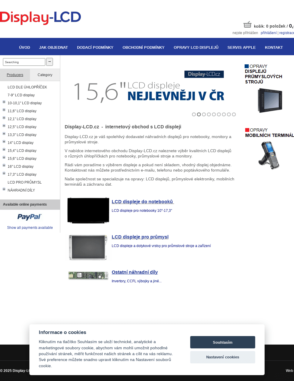 LCD displej si v přehledné navigaci e-shopu jednoduše vyberete. Vybírat je možné dle úhlopříčky, modelu displeje a nebo modelu notebooku do kterého display hledáte. Display-LCD.cz má k dispozici jedny z největších skladových zásob v ČR. V nabídce e-shopu Display-LCD.cz jsou také displeje s "drobnou výrobní vadou". Tyto displeje jsou také nové a se zárukou, ale mají z výroby drobnou vadu (např. vadné 1-2pixely). Nenajdete-li v nabídce požadovaný displej, stačí poslat poptávku pomocí chatu, kontaktního formuláře nebo e-mailu.