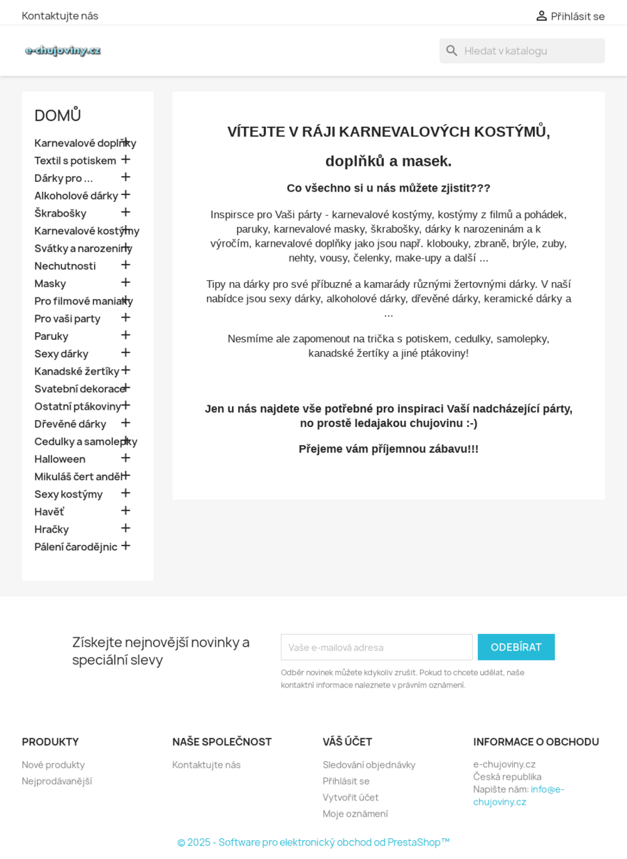 Jedná se především o produkty, které využijete na Vaší párty, nebo dárky k narozeninám a výročím, karnevalové kostýmy, kostýmy z filmů a pohádek, paruky, karnevalové masky, škrabošky, různé karnevalové doplňky jako např. klobouky, zbraně, brýle, zuby, nehty, vousy, čelenky, make-upy apod. V naší nabídce jsou ale i takové věci jako hovínka, pavouci, mouchy apod. :)